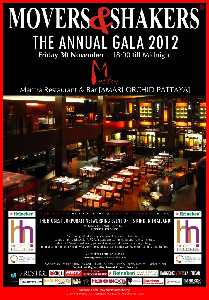 Although the whole thing sounds like a dire exercise in masturbatory self-congratulation, it should be mentioned that it is for charity; so your 1,900 baht exclusive* VIP ticket (including access to special VIP zones**) will be going to a good cause, although not directly: “Movers & SHAKERS does NOT donate CASH money for charity projects but provides specific goods or services to suit each charity cause.”