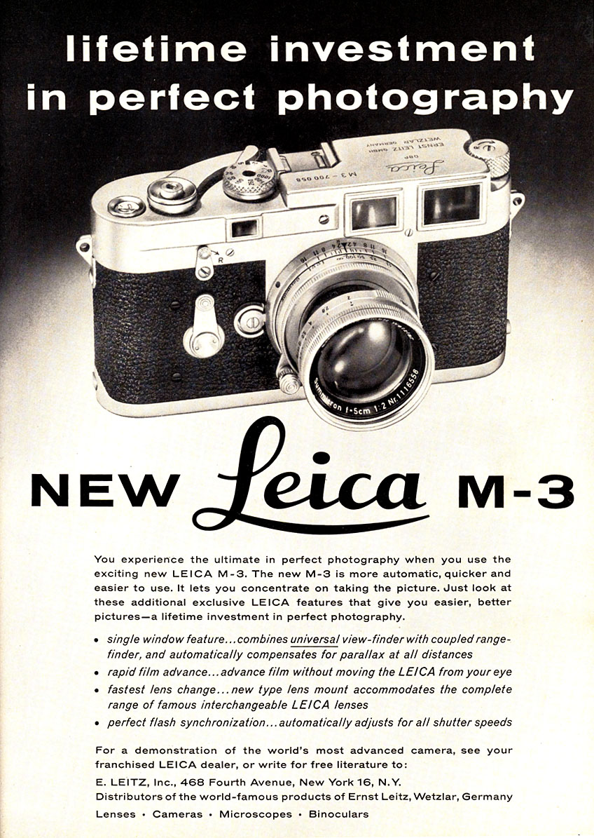 The manual that accompanied the M3 proclaimed it “as nearly automatic and foolproof as a camera can be made”, which in modern terms means not automatic at all. You set the focus via the rangefinder, exposure via the aperture on the lens, coupled with the shutter speed set via a dial on top of the camera (without the benefit of a built-in meter), and press the shutter. But in 1954 this was as good as you were going to get, and the M3 was a huge success with photojournalists, professionals, and amateurs with deep pockets. More than 200,000 were sold during the period 1954-1966 and, so robust is the basic design, most of those are likely still functional. The tag line, a “lifetime in investment in perfect photography” probably should have read “several lifetimes”, because the M3 just keeps on going, provided it receives some love and lubrication every fifteen years or so.