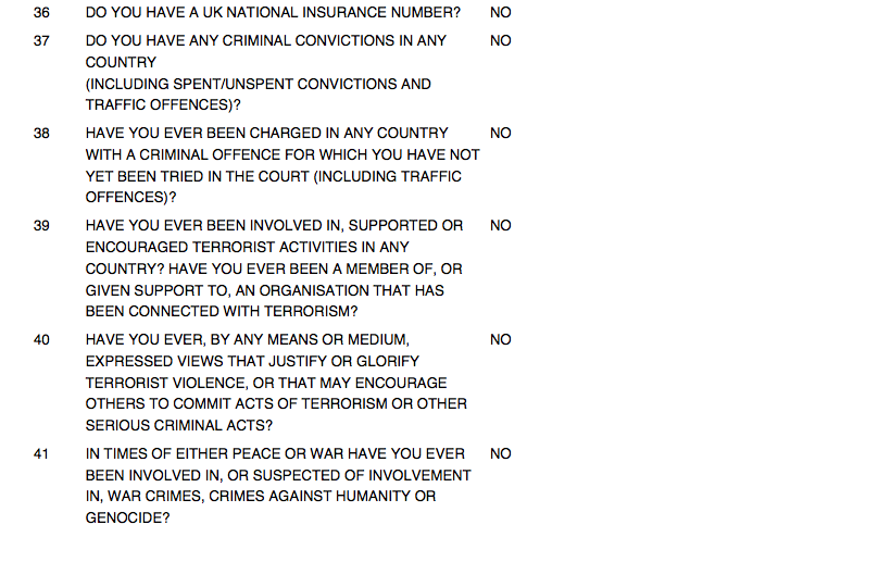 As a result of your “yes” answer, it will then be necessary for one or more people somewhere in the Home Office to go through your answers and figure out whether or not you are a serious threat to UK security, or if you were someone who was not paying attention when a uniformed police officer pointed a RADAR gun at you…